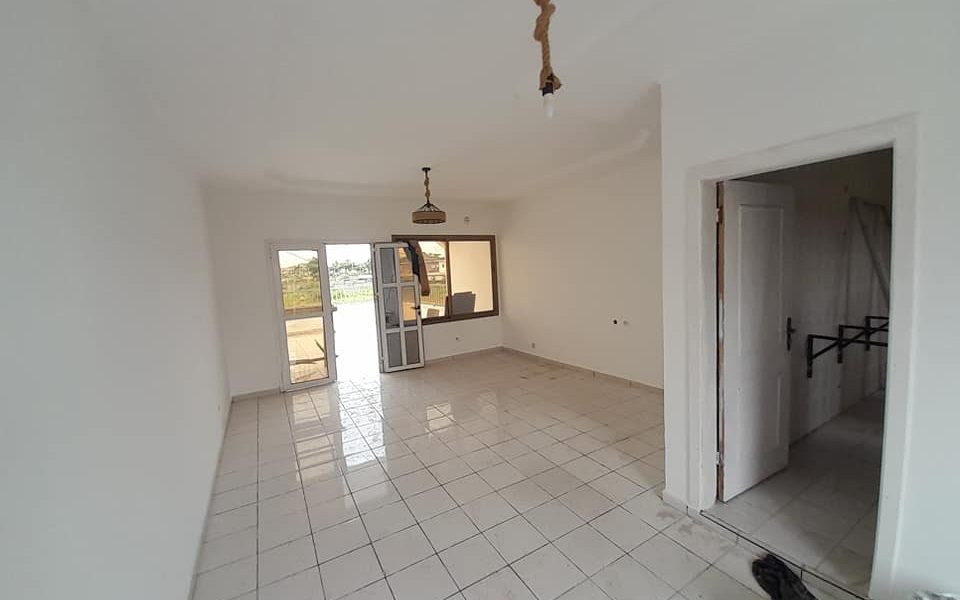 Un salon, une cuisine, un balcon