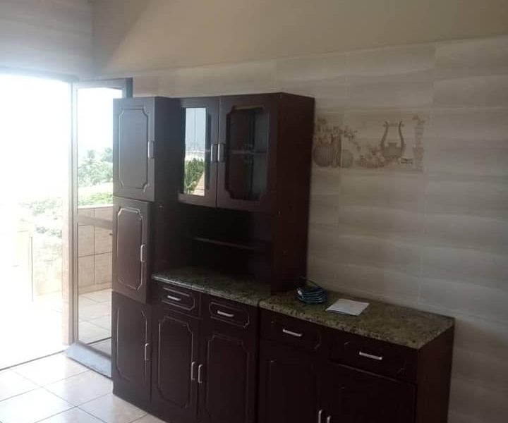 Appartement de 3 chambres avec placards grand salon cuisine avec placards buanderie branchement machine à laver chauffe-eau WC visiteur au couloir et 3 douches WC Terrasse avant et arrière parking espace vert gardien NB:Eau 24/24